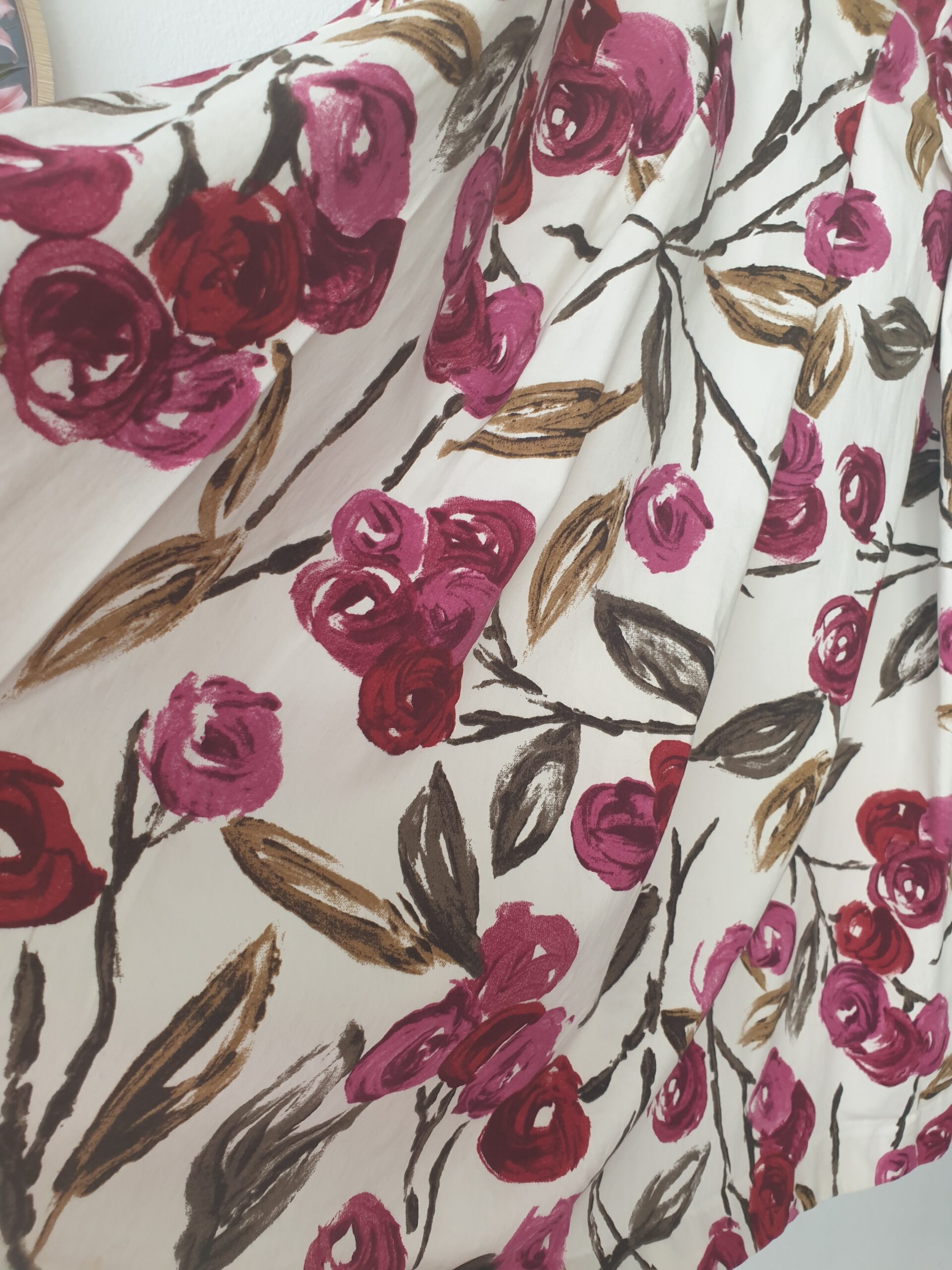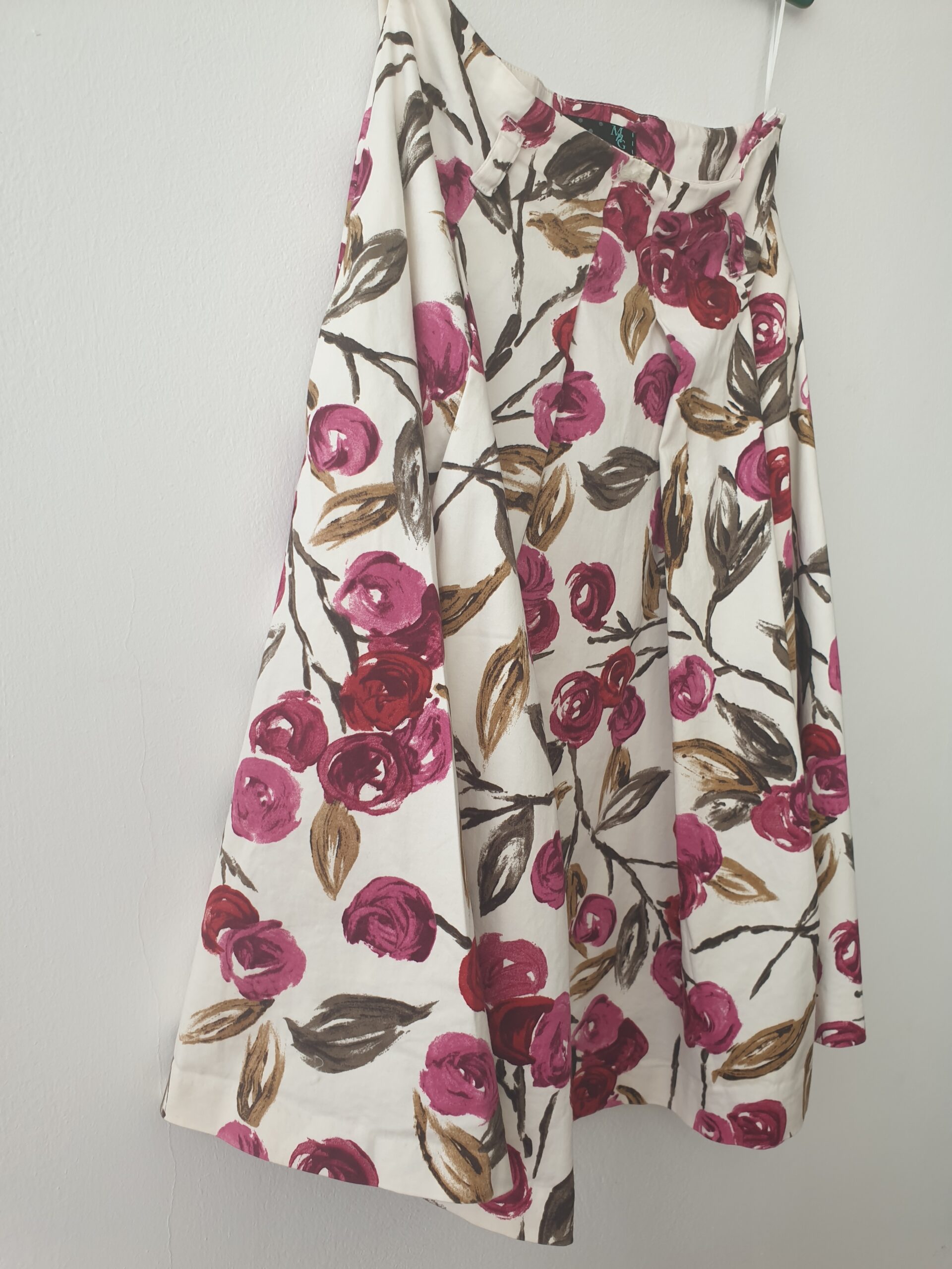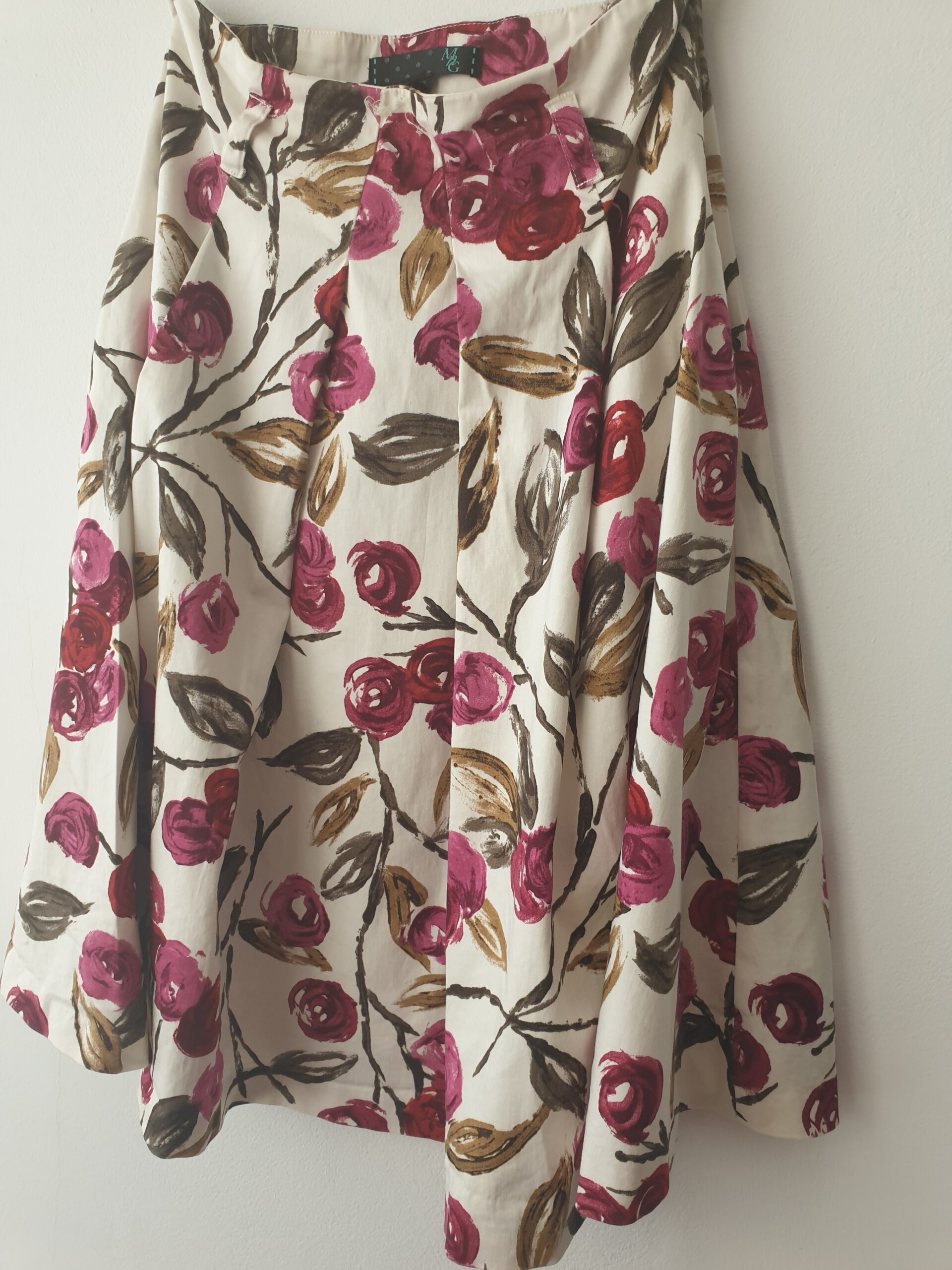 A charming vintage 50’s style floral midi skirt with a full, twirly silhouette—perfect for dancing and fairy-tale twirls. Knee-length with soft, flowy fabric that moves beautifully in spring and summer breezes. A timeless piece full of joy and elegance.