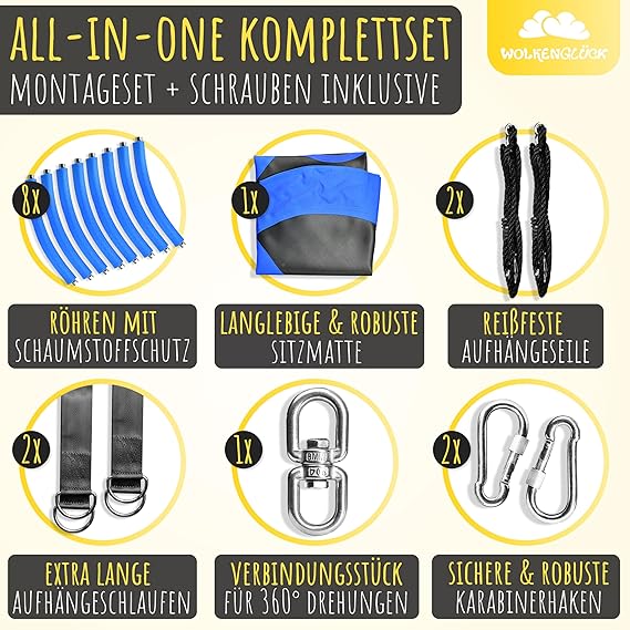 WOLKENGLÜCK® Nest Swing [Diameter 110 cm] – Height-Adjustable Swing Outdoor & Indoor for Children and Adults [Maximum Load 150 kg] – Plate Swing Including Mounting Accessories – Children’s Swing