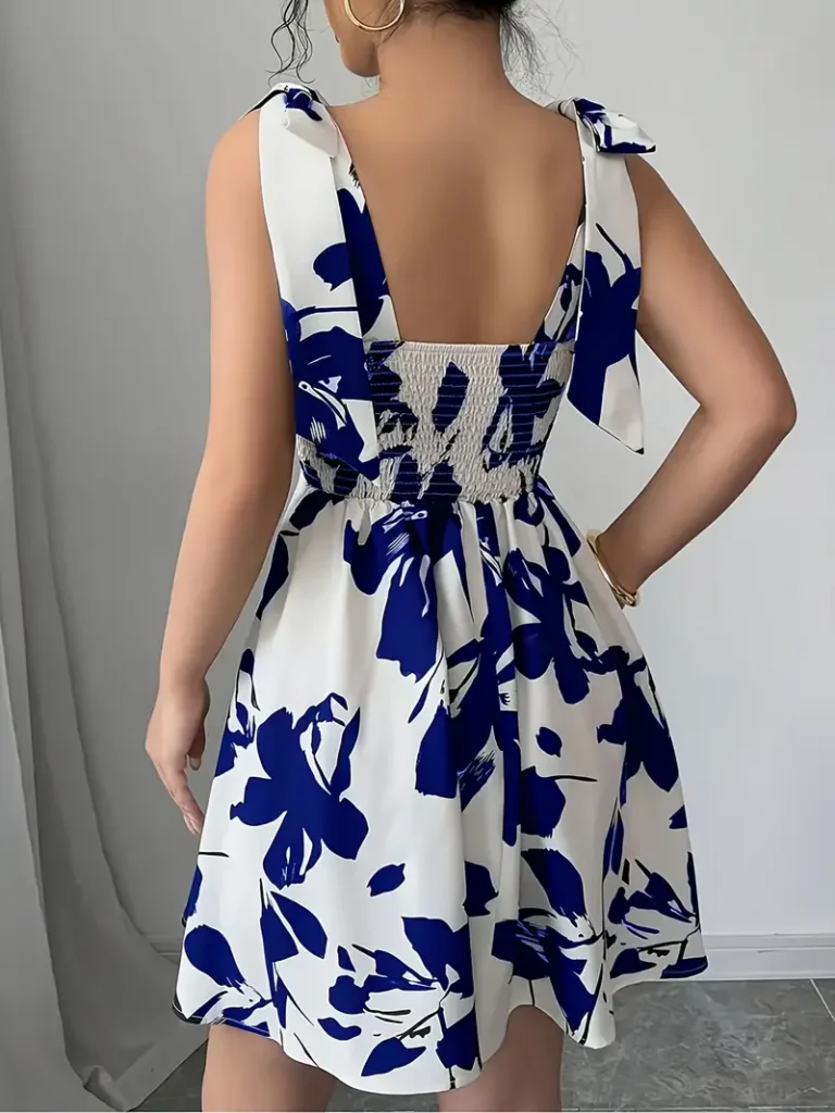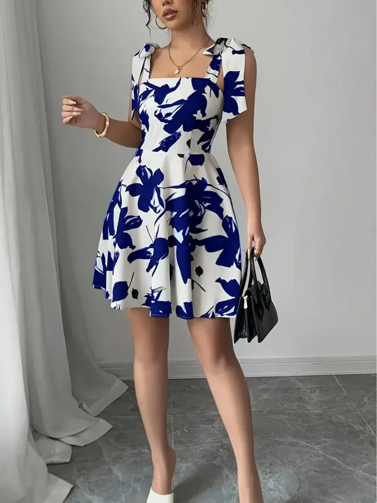 Women’s Floral Print Spaghetti Strap A-Line Dress – Navy Blue & White Short Sleeve Summer Dress with Adjustable Waist Tie, Machine Washable for Spring/Summer Casual & Formal Occasions, Spaghetti Suspender Dress, Occasion Attire, Elegant Style, Fitted Silhouette