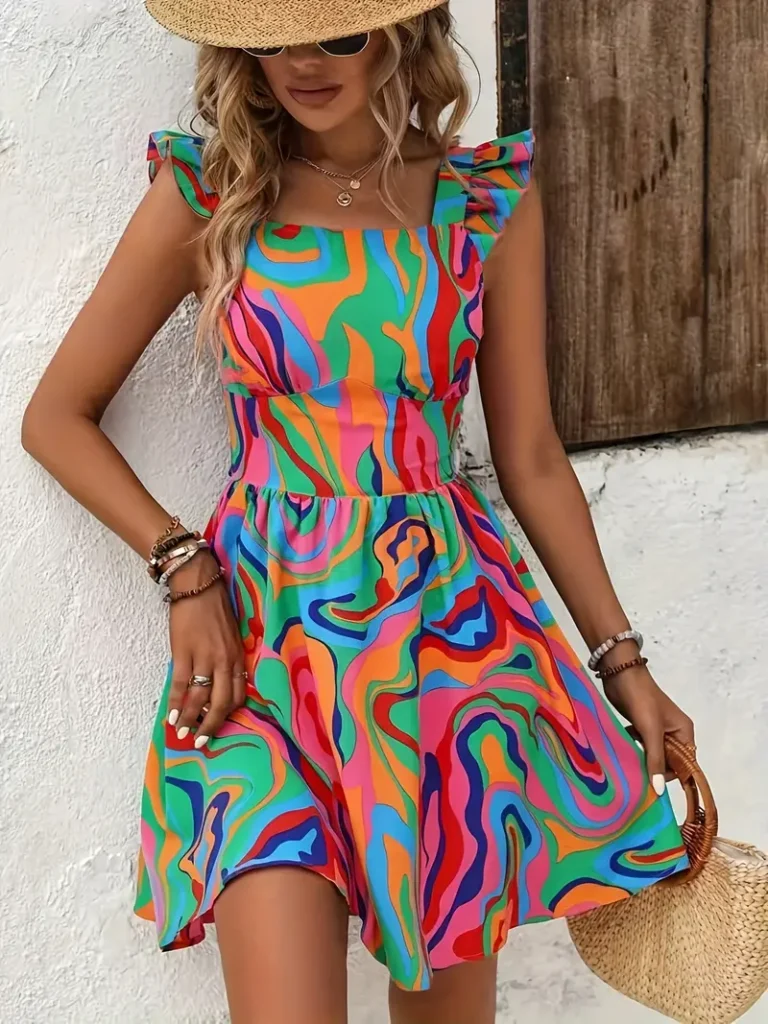 Bring a touch of paradise into your wardrobe with this Women’s Tropical Print A-Line Dress. Designed with a flattering square neckline, short sleeves, and a comfortable A-line silhouette, this dress is perfect for warm summer days.